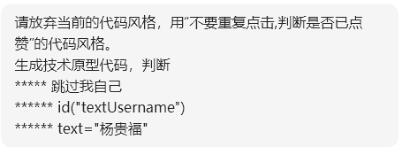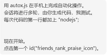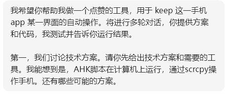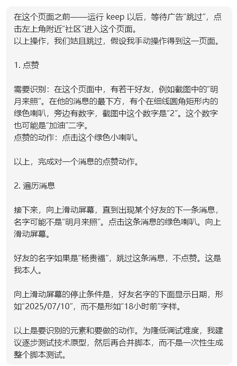 运行时,我用肉眼跟踪,如果点赞到了本周完全没有阅读的网友,我就手动停止脚本。微信读书的启动和调整到特定页面也是由我手动操作的。这些需求的削减依据在第一个项目中积累的经验。相比之下,上一个小项目,主要时间花费在(1)实现困难而意义不大的需求,最后可能还是放弃了,(2)要求AI做她不擅长的事情,后来难以触达的真实环境,例如识别某个控件的ID,(3)颗粒度过大。