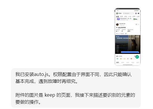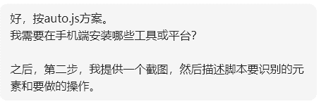 豆包的答复表明,对技术方案讨论是必要的,我的思路太狭隘了。我以为她会selenium之类的,她给出了3种PC端控制方案,3种安卓的方案,还有混合方案。其中,她推荐的方案是纯安卓的方案中 autox.js,我听HYR同学提到过,就选了这个方案。