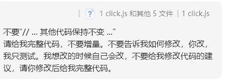 为了调试方便,我禁止AI要求我增量修改代码,她遵从了,虽然需要反复重申很多次。事实上,即使我的环境是否粘贴代码,我也觉得AI对于描述如何修改的表述能力欠佳,精确程度不足,指代不明经常出现,可能她学习的语料库就是这样的。